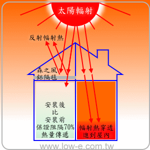 建築隔熱,更重要的是隔熱材料的熱輻射率E值(物體吸收熱量再從其表面輻射的強度稱為E值),E值越小代表其吸收率越少,因此選擇低E值﹙Low-E﹚的材料才能有效減少熱量被屋內空氣吸收,以達到隔熱的效果。