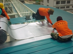 只要鐵工安裝屋面時,順便鋪上鋁隔毯,一片鋁隔毯一片鐵皮,可以先將鋁隔毯假固定在中脊及滴水的C型鋼架上,然後鋪上鐵皮,再用自攻牙螺絲穿過鐵皮跟鋁隔毯固定在骨架上.安裝後,就能享受涼爽的夏天,溫暖的冬天,安靜的下雨天.此一鐵皮屋頂隔熱價格很便宜.經濟實惠又有效.
